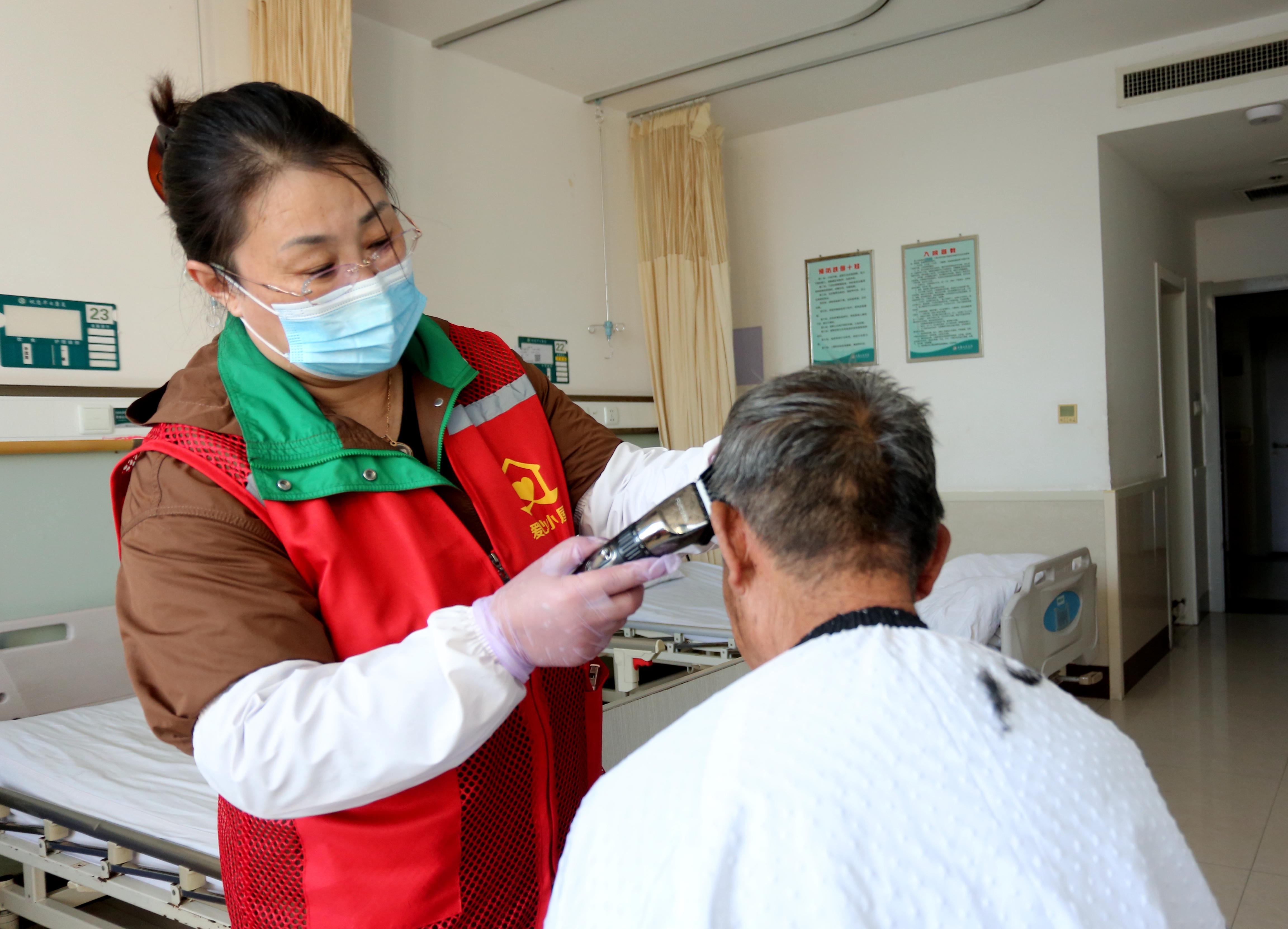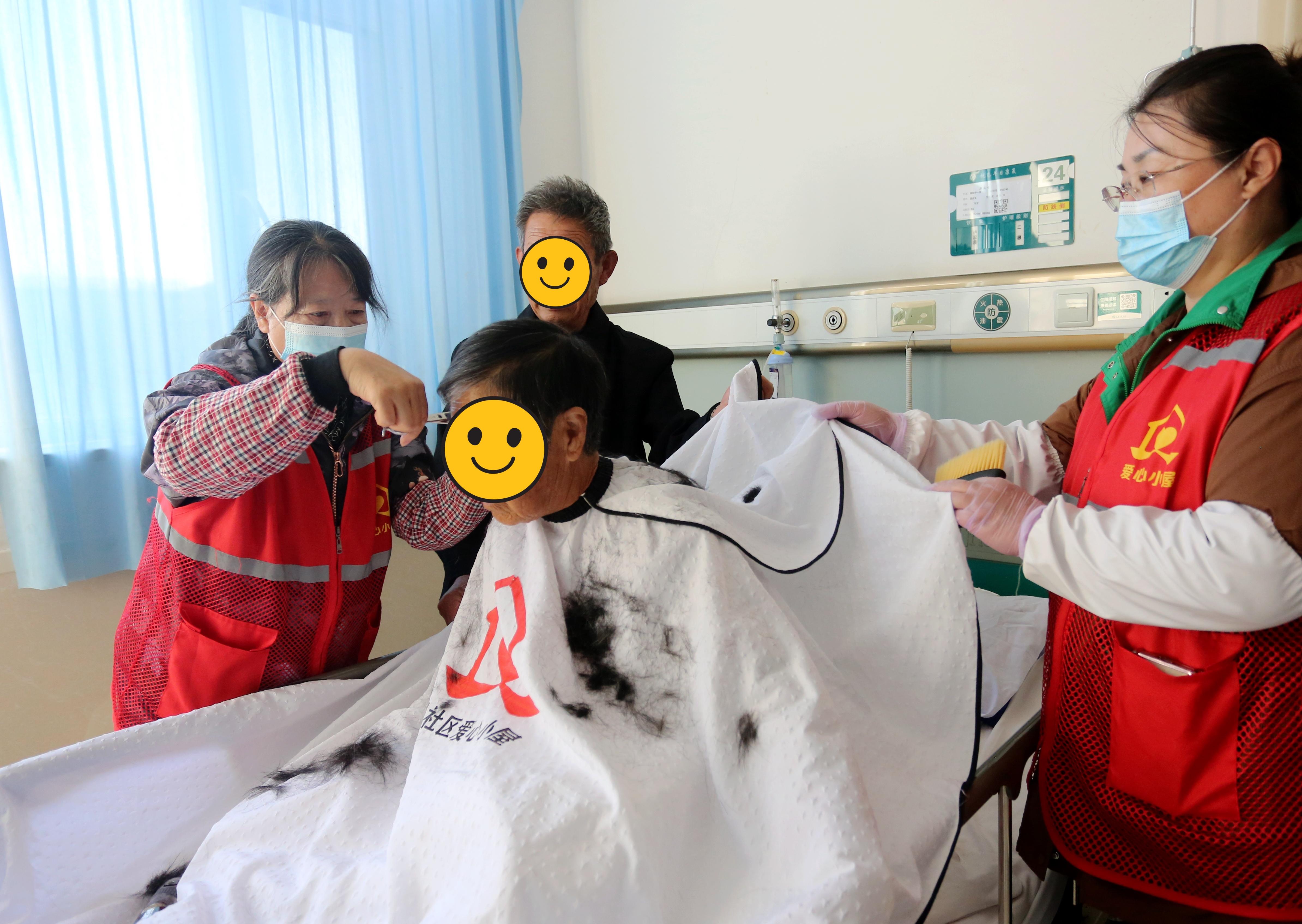 考虑到神经外科、肿瘤科、心内一等科室部分患者行动受限,志愿者们分成两组,带着理发工具深入各病区病房。在胸泌尿外科病房,志愿者为卧床的阿姨梳理头发、细致修剪,家属在一旁连连道谢:“老人行动不便,出门理发特别困难,你们能上门服务,解决了我们的大问题,太感谢你们了!”